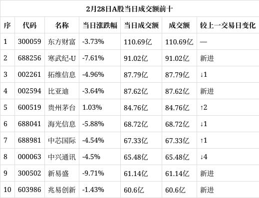 截至当日收盘数据,A股当日成交额前十的分别为:东方财富、寒武纪-U、拓维信息、比亚迪、贵州茅台、海光信息、中芯国际、中兴通讯、新易盛、兆易创新。