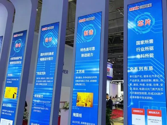 现场,中国电科围绕“锻造汽车芯片全产业链”主题,向公众展示了材料、装备、设计、制造、芯片、基础软件、检测认证、汽车电子产品及整车应用共9个板块。
