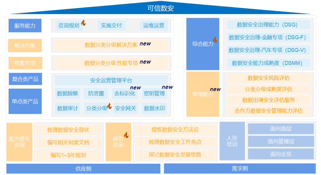 “可信数安”工作体系是国内领先的数据安全评估体系,通过向需求侧进行企业级、系统级的数据安全评估,协助各组织提升安全能力,实现以评促建的效果。同时,也面向供应侧进行产品测试及服务能力评估,筛选出优秀的产品与服务,以此推动技术及服务水平的持续进步。