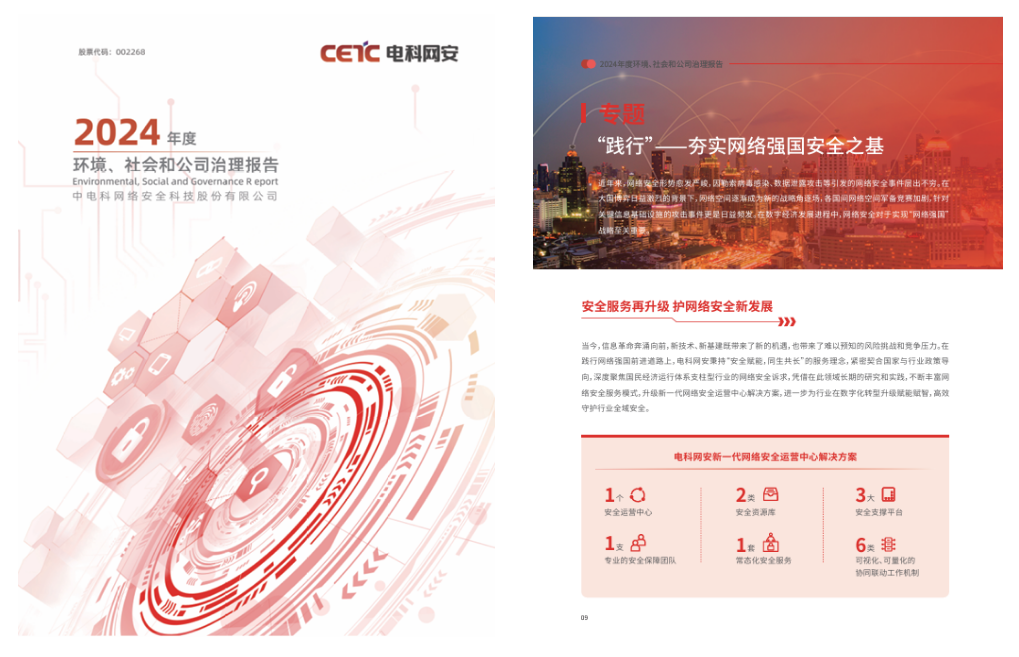 作为ESG信息披露的重要载体,4月29日,公司正式对外发布《2024年电科网安ESG报告》。本次报告严格对标交易所发布的《可持续发展报告指引》,进一步夯实上市公司ESG信息披露基础,按照财务重要性与影响重要性双重重要性要求,以“治理”“战略”“影响、风险和机遇管理”“指标和目标”四大要素,详尽地展示了公司在可持续发展领域的实践成果与绩效表现。