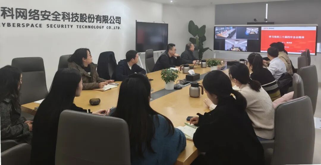 公司党委“第一议题”学习《中国共产党第二十届中央委员会第四次全体会议公报》。为进一步推动全会精神走深走实,公司研究制定《电科网安党委学习宣传贯彻党的二十届四中全会精神工作计划》,清单式明确学习培训、集中宣讲、新闻宣传、组织实施等方面的责任主体、任务节点等。会议要求,公司党委、各党(总)支部要做好党的二十届四中全会精神学习宣贯,锚定国家“十五五”规划方向,结合公司主责主业,将加快高水平科技自立自强引领发展新质生产力、推进国家安全体系和能力现代化、激发创新创造活力等方面的重要部署在公司战略规划滚动修订中推进落地,以实干实绩推动公司高质量发展。