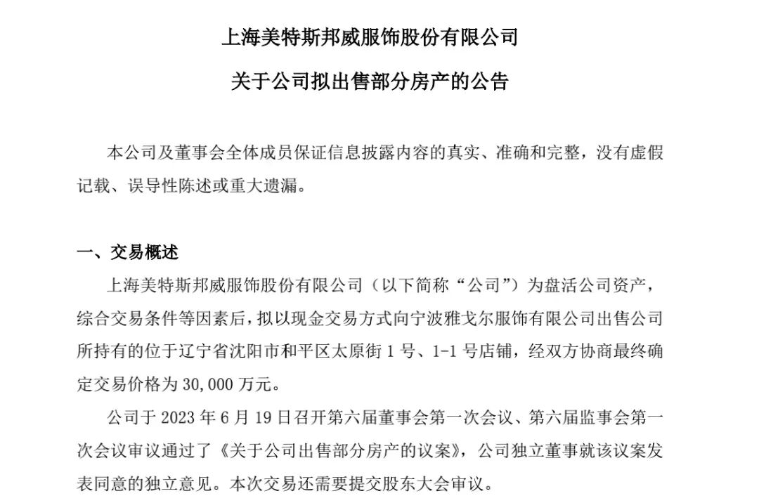 6月19日晚间,美邦服饰发布公告称,为盘活公司资产,综合交易条件等因素后,拟以现金交易方式向宁波雅戈尔服饰有限公司出售公司所持有的位于辽宁省沈阳市和平区太原街1号、1-1号店铺,经双方协商最终确定交易价格为3亿元。