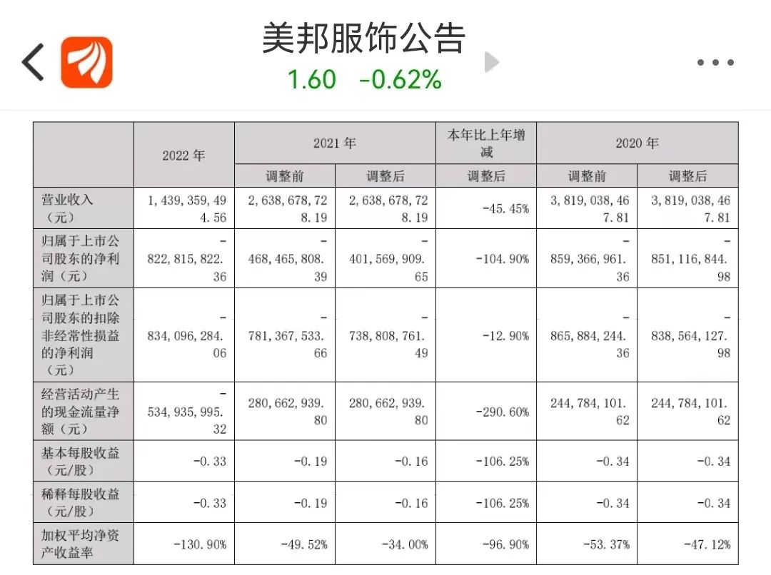 虽然美邦服饰频频出售资产回血,但依旧无力改变连年亏损的业绩数据。美邦服饰2019年业绩爆雷,随后一直处于亏损状态,4年累计亏损近30亿元。