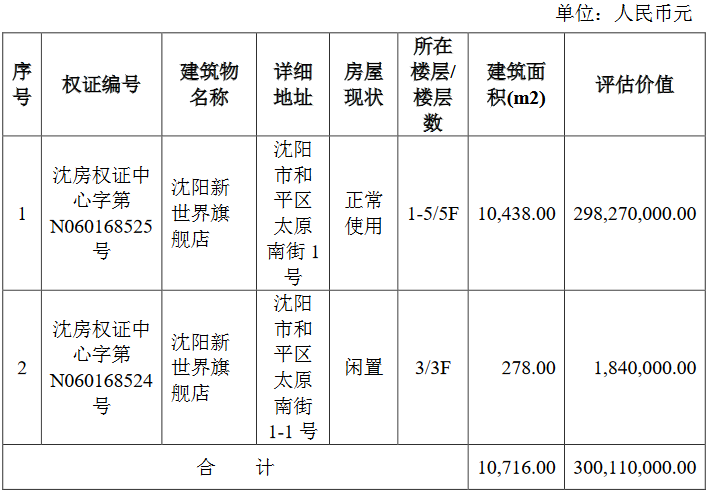 公告显示,两处房屋系美邦服饰的“沈阳新世界旗舰店”,建筑面积合计10716平方米,其中10438平方米的1号店铺处于正常使用状态,278平方米的1-1号商铺处于闲置状态。