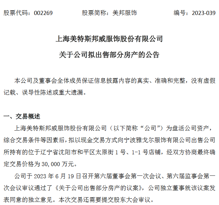 近日,美邦服饰发布公告称,拟以现金交易方式向宁波雅戈尔服饰有限公司出售位于辽宁省沈阳市和平区太原南街1号、1-1号店铺,交易价格为3亿元。