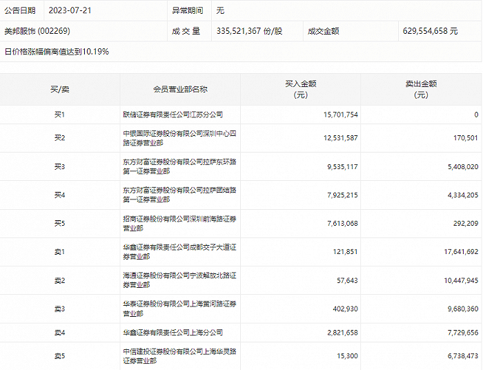 7月21日,美邦服饰今日涨停,龙虎榜数据显示,上榜营业部席位全天成交1.19亿元,占当日总成交金额比例为18.93%。其中,买入金额为5672.61万元,卖出金额为6244.31万元,合计净卖出571.69万元。
