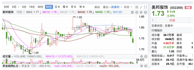 截至发稿,美邦服饰股价下跌3.35%至1.73元/股。