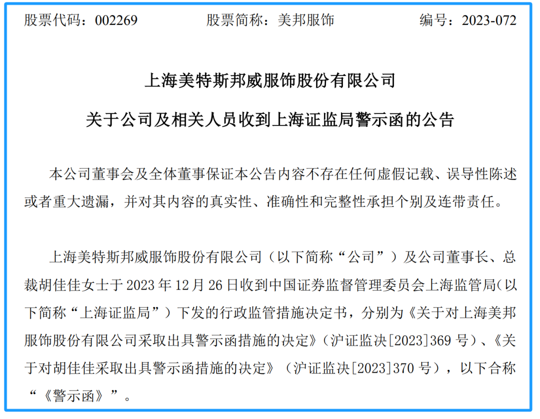 公告显示,美邦服饰上述行为违反了相关规定,上海证监局对美邦服饰采取出具警示函的行政监管措施。胡佳佳自2016年11月30日至今任美邦服饰董事长、总裁,对公司上述事项负有主要责任,依据有关规定,上海证监局对胡佳佳采取出具警示函的行政监管措施。