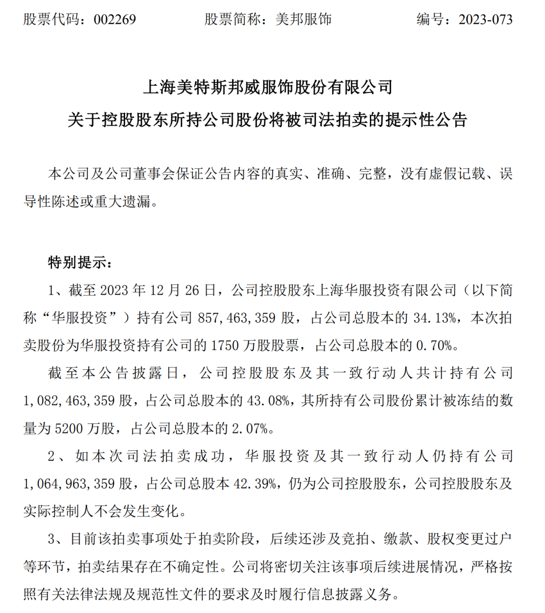 另外,美邦服饰于近日通过淘宝网司法拍卖网络平台查询获悉,公司控股股东华服投资所持公司1750万股股票将被司法拍卖。截至2023年12月26日,华服投资持有公司8.57亿股,占公司总股本的34.13%。公司控股股东及其一致行动人共计持有公司10.82亿股,占公司总股本的43.08%。