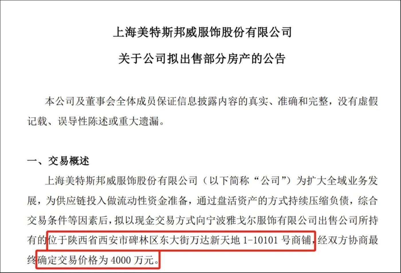 12月26日晚间,美邦服饰发布公告称,拟以现金交易方式向宁波雅戈尔服饰有限公司(以下简称“雅戈尔”)出售公司所持有的位于陕西省西安市碑林区东大街万达新天地1-10101号商铺,经双方协商最终确定交易价格为4000万元。