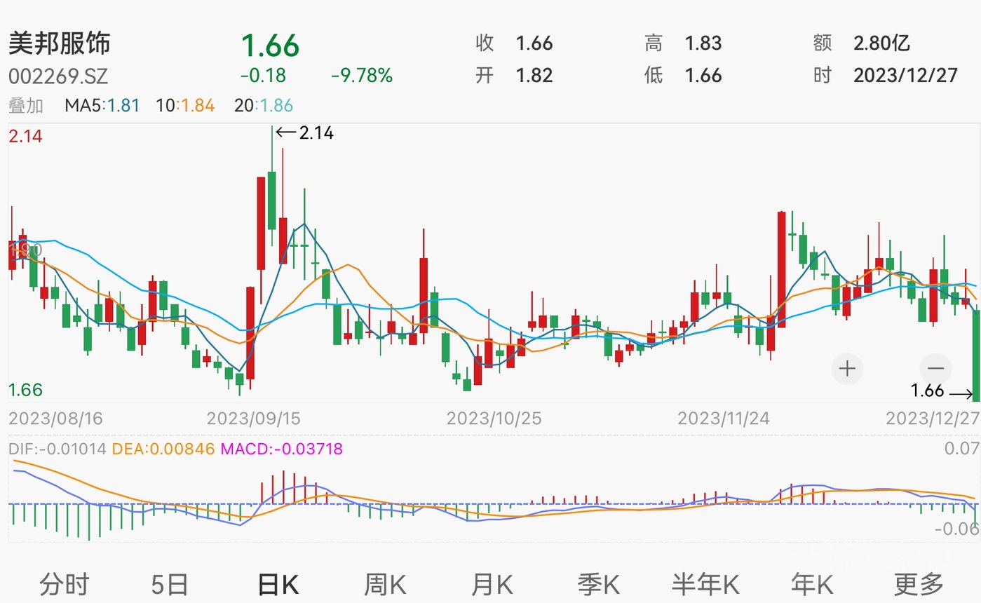二级市场方面,受到接连的利空消息影响,美邦服饰股价在12月27日出现大跳水,低开后持续走低,截至今天收盘,公司股价报收1.66元,跌9.78%,当前公司总市值约41.71亿元。
