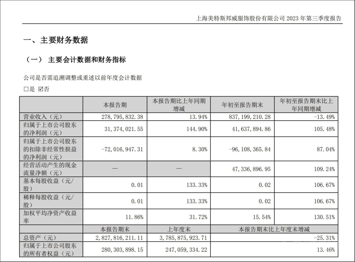 虽然加盟渠道略显不足,但电商渠道势头正旺。自8月份以来,美邦服饰重点发力抖音直播,美特斯邦威品牌更是凭借“春晚”式直播出圈。得益于电商业务的发展,美邦服饰在今年第三季度实现营收反弹,同比增长13.94%至2.79亿元,为2023年以来单季度营收首次增长;扣非归母净利润为-7202万元,同比收窄8.3%。
