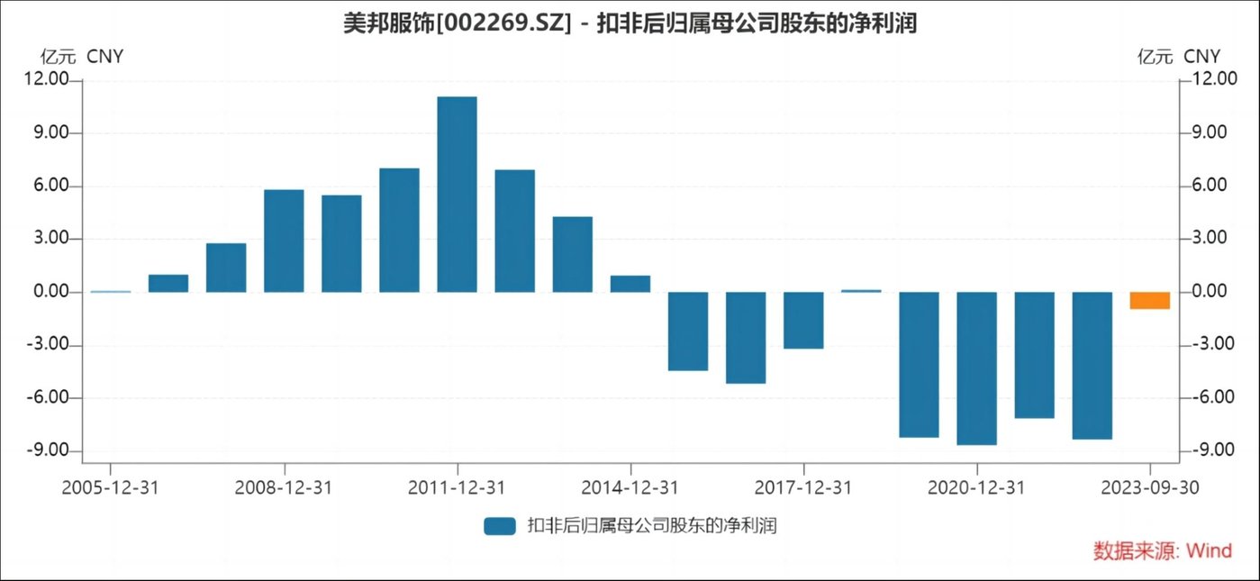 财务数据显示,2019年至2023年前三季度,美邦服饰的营收分别为54.63亿元、38.19亿元、26.39亿元、14.39亿元、2.79亿元;同期的扣非净利润分别约-8.26亿元、-8.59亿元、-4.02亿元、-8.23亿元、-7201.69万元。