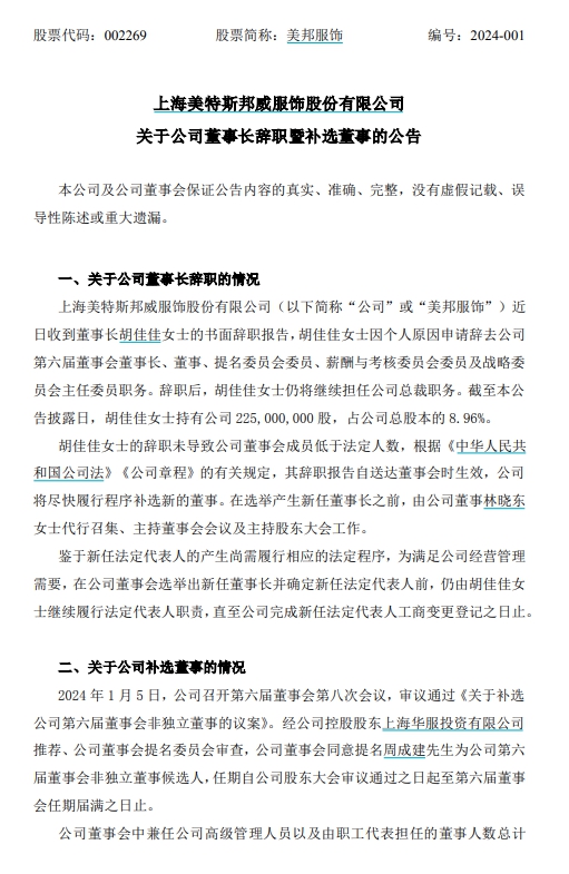 彼时,美邦服饰公告称,周成建向公司董事会申请辞去其所担任的公司董事长、董事及董事会下设各专门委员会的委员职务,并同时申请辞去公司总裁职务。另外,公司董事会同意选举胡佳佳为公司董事长。同时,董事会同意聘任胡佳佳为公司总裁。