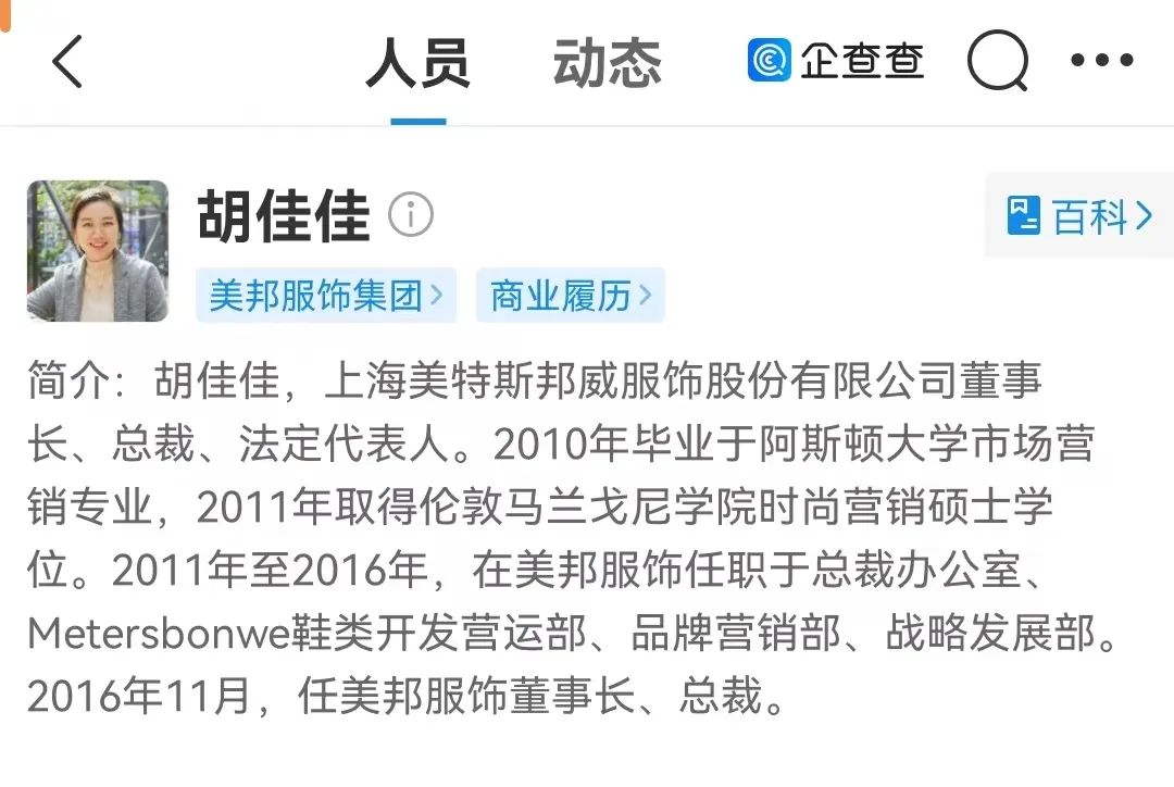 公告显示,周成建先生系浙江大学EMBA,于1984年5月开始个体经商,1995年在温州开设第一家美特斯?邦威专卖店,实行品牌连锁经营;曾任温州市凯莉莎服装厂总经理、温州市美特斯制衣有限公司董事长、温州美特斯邦威有限公司董事长、美特斯邦威集团有限公司董事长兼总裁,美邦服饰第一、二、三届董事会董事长,美邦服饰控股股东上海华服投资有限公司的执行董事、实际控制人,即为美邦服饰的实际控制人,其未直接持有公司股票,与持有公司股票2.25亿股(占公司总股本的8.96%)的胡佳佳女士系父女关系。