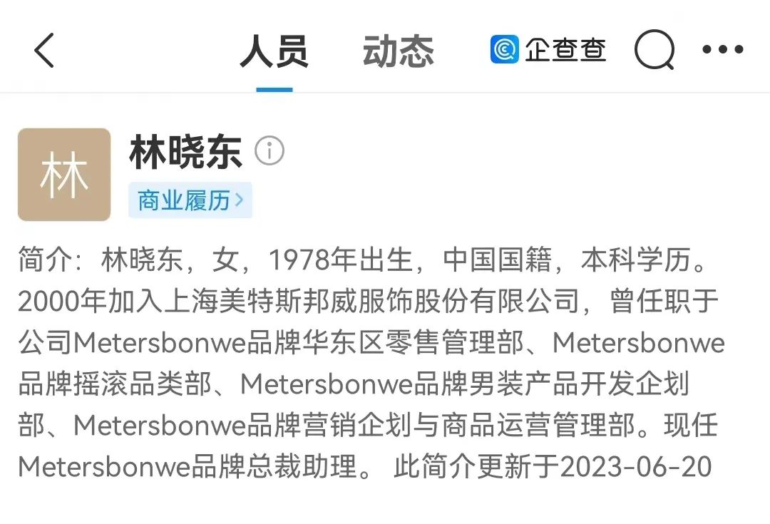 公开资料显示,林晓东女士出生于1978年出生,本科学历,2000年加入美邦服饰,曾任职于公司Metersbonwe品牌华东区零售管理部、Metersbonwe品牌摇滚品类部、Metersbonwe品牌男装产品开发企划部、Metersbonwe品牌营销企划与商品运营管理部,现任Metersbonwe品牌总裁助理。