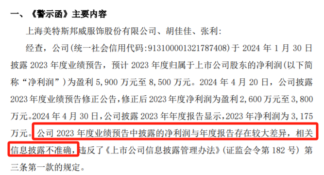 上海证监局指出,美邦服饰2023年度业绩预告披露的归母净利润,与其年报披露的数据存在较大差异,导致相关信息披露不准确,违反了《上市公司信息披露管理办法》(证监会令第182号)第三条第一款的规定。