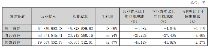 在渠道维度,公司上半年三大销售渠道全线承压,线上渠道收入同比下滑4.98%至6434万元;直营渠道收入同比下滑21.72%至5357.18万元;加盟渠道收入更是同比大幅下滑44.12%至7961.76万元。