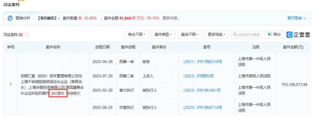 具体诉讼事项上,2025年6月25日, 上海市第一中级人民法院 对浙银汇智(杭州)资本管理有限公司与 上海千峡湖旅游咨询合伙企业 (有限合伙)、 上海华服投资有限公司 、周成建等的合伙企业纠纷案件作出恢复执行决定,周成建等被告需执行的金额达7.97亿元。