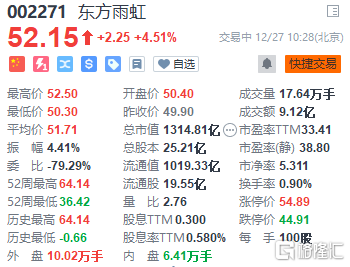 格隆汇12月27日丨东方雨虹(002271.SZ)继续走强,现报52.15元,涨幅4.5%,市值1314.8亿,月内累计涨逾30%。12月23日,东方雨虹与深圳创维光伏科技有限公司在深圳签署战略合作协议,双方将在光伏屋面一体化领域、建筑修缮领域进一步深化业务合作。