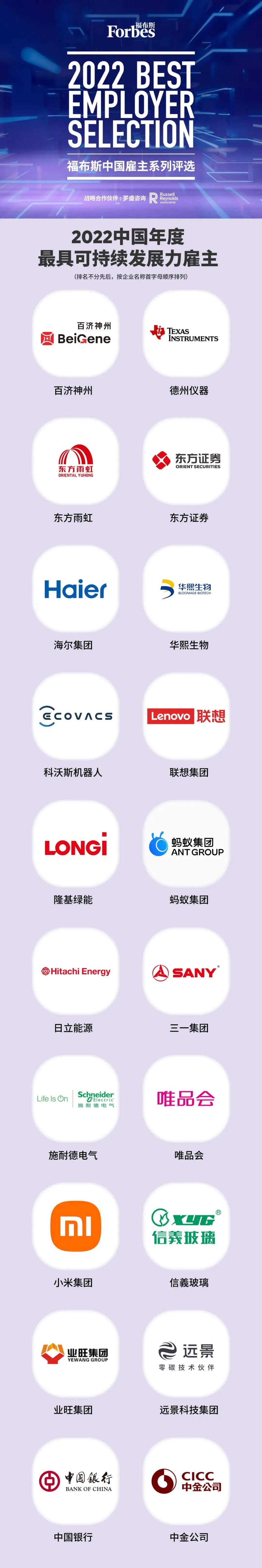 据悉,本次“2022福布斯中国?最佳雇主”系列评选活动有近300家企业、超7万人次参与,前后历时3个月,设有主评选及子评选,从雇主企业和雇员的双重视角,以公开报名、问卷调研等方式获取反馈,并邀请各领域专家学者从多元化维度对企业进行评估审视,从而保证中立性与专业性。