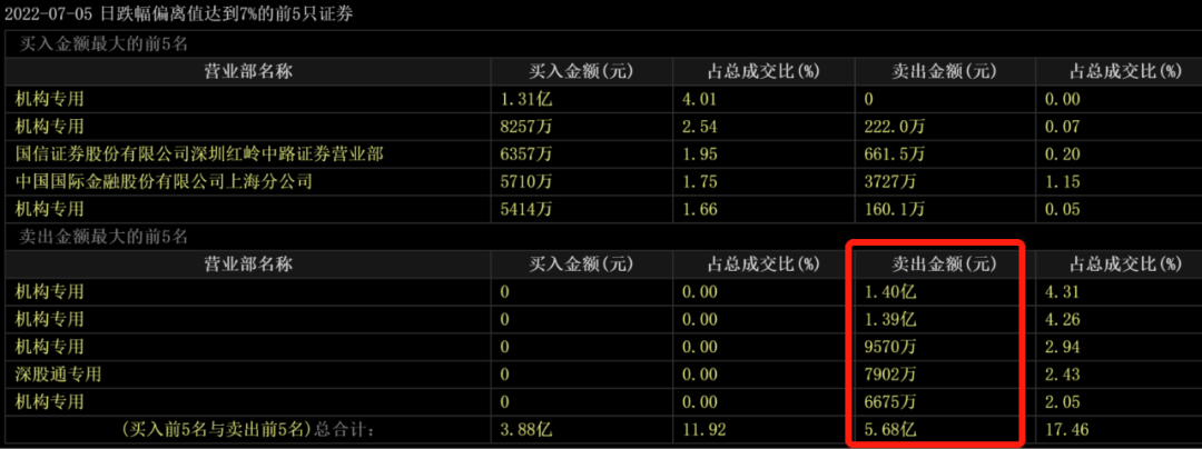 至于跌停的原因,有人认为是主力提前得知上半年业绩不及预期的消息。因为当天的龙虎榜显示,卖出前五名由四个机构席位和一个代表“聪明钱”的深股通席位组成。