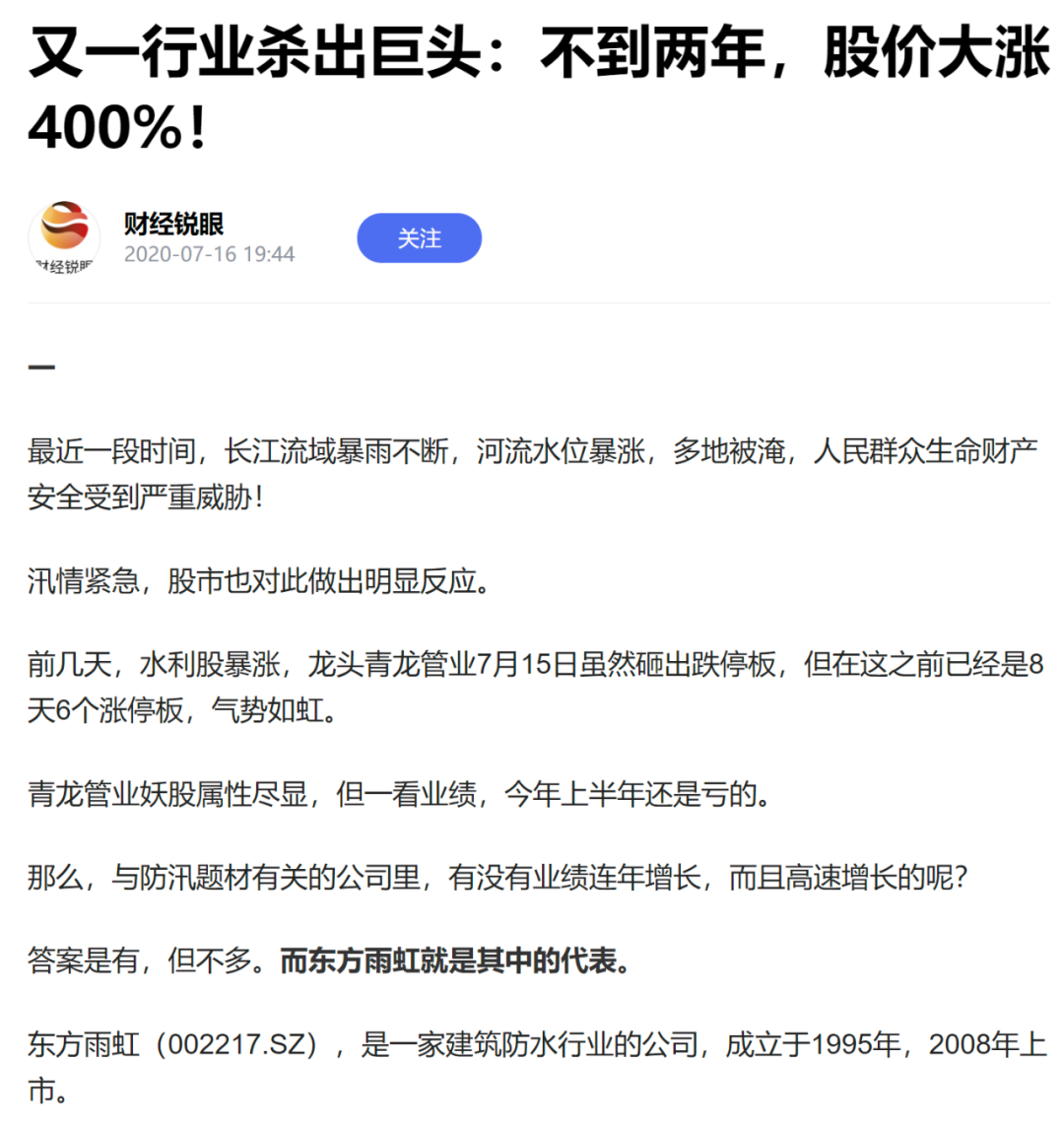 应该说,笔者这篇文章还是有一定价值的。文章发布后,东方雨虹的内在价值也的确被市场所发现,远远跑赢了同期大盘。