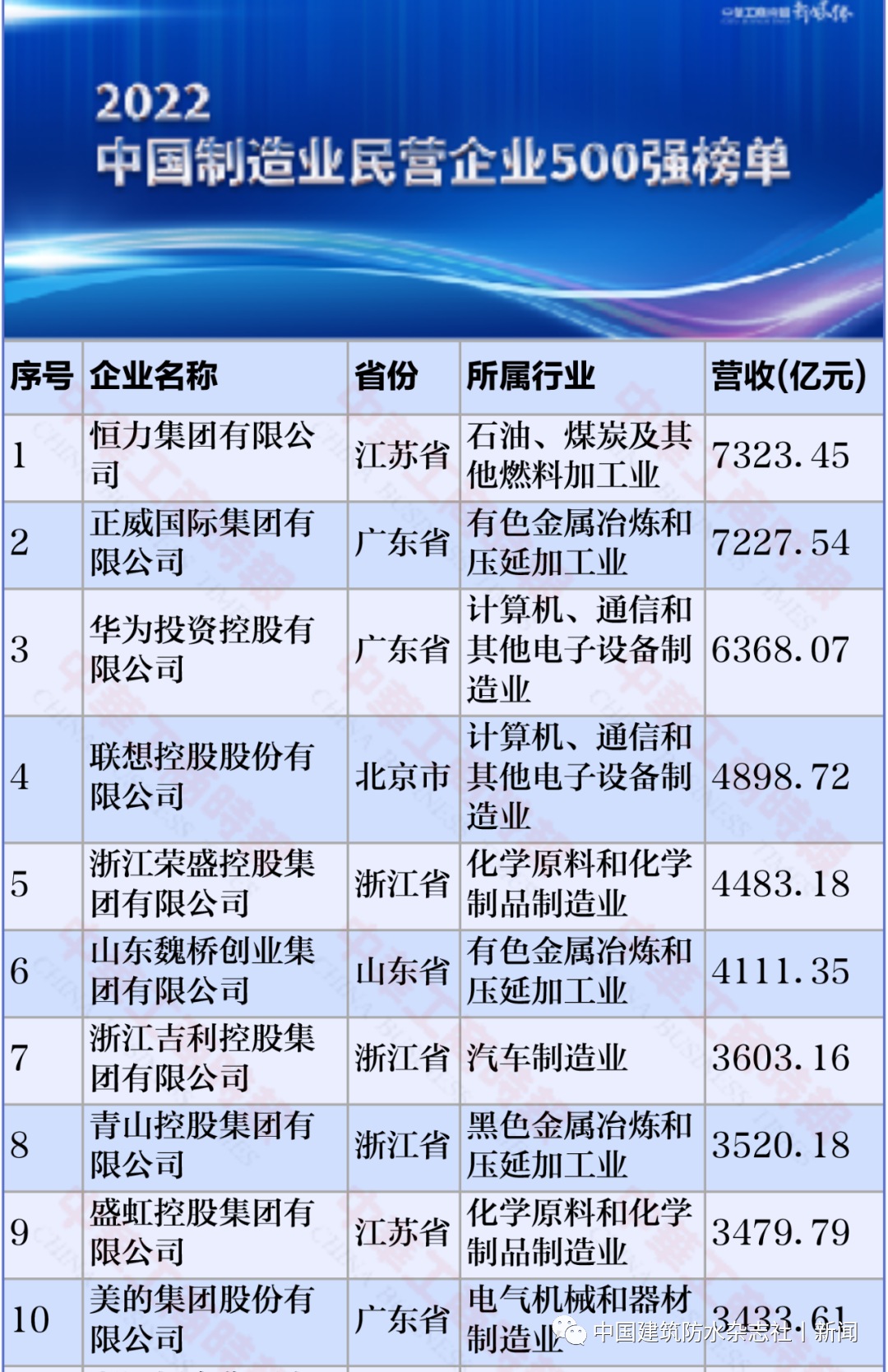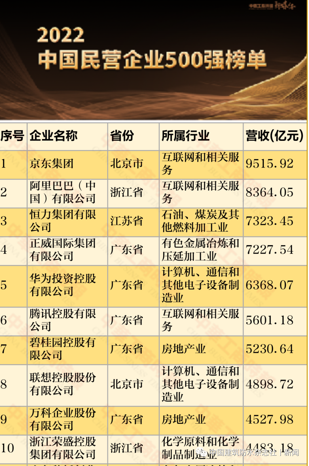 榜单显示,北京东方雨虹防水技术股份有限公司位列2022中国民营企业500强第366位,同时,东方雨虹还上榜了2022中国制造业民营企业500强,位列第231位。
