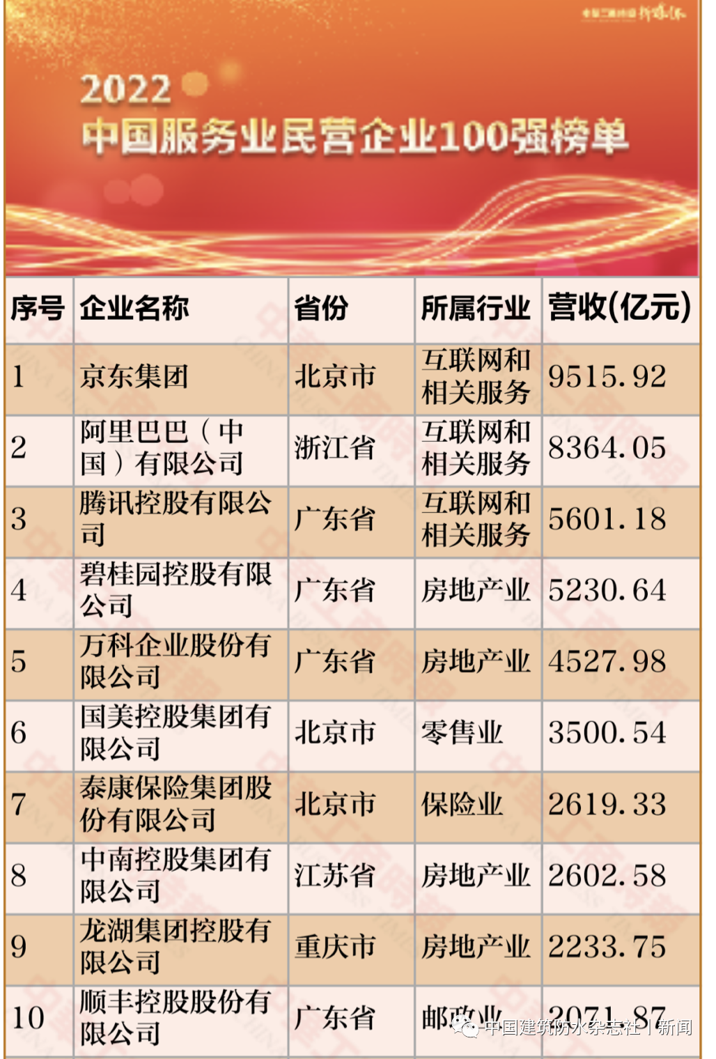 2022中国服务业民营企业100强上榜门槛为301.16亿元,较上年减少21.61亿元。京东、阿里巴巴、腾讯分列前3位。