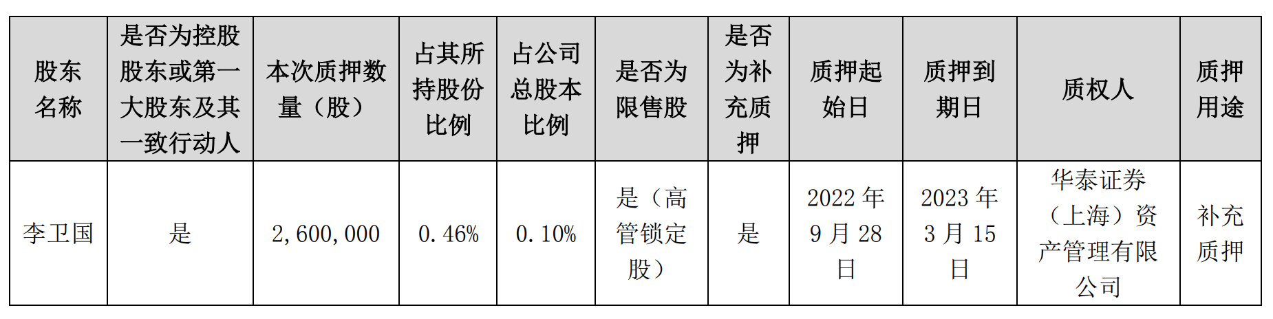 公告显示,东方雨虹近日接到公司控股股东、实际控制人李卫国函告,获悉李卫国所持有东方雨虹的260万股股份被质押,占总股本比例为0.01%。