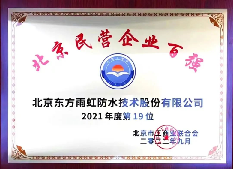 9月26日,北京市工商业联合会发布2022北京民营企业“1+4”榜单。东方雨虹凭借高质量品质经营上榜“2021年度北京民营企业百强”榜单第19位。