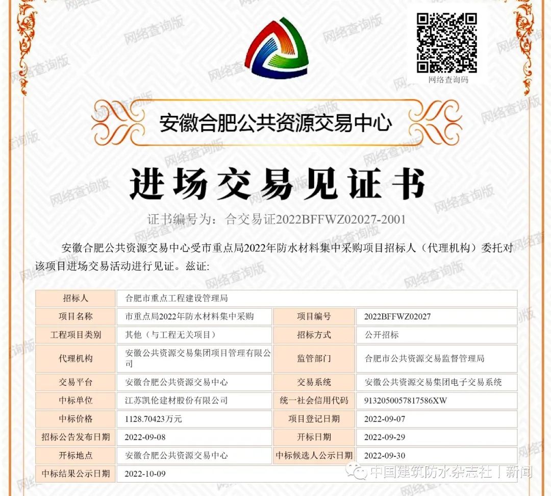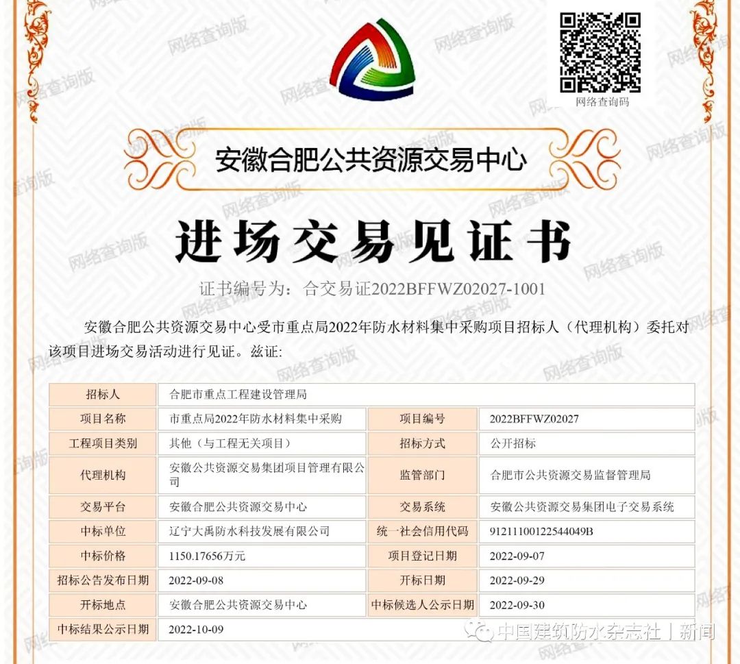 10月10日,安徽合肥公共资源交易中心按照程序,向东方雨虹、凯伦股份和辽宁大禹三家中标企业发出了进场交易见证书,分别如下: