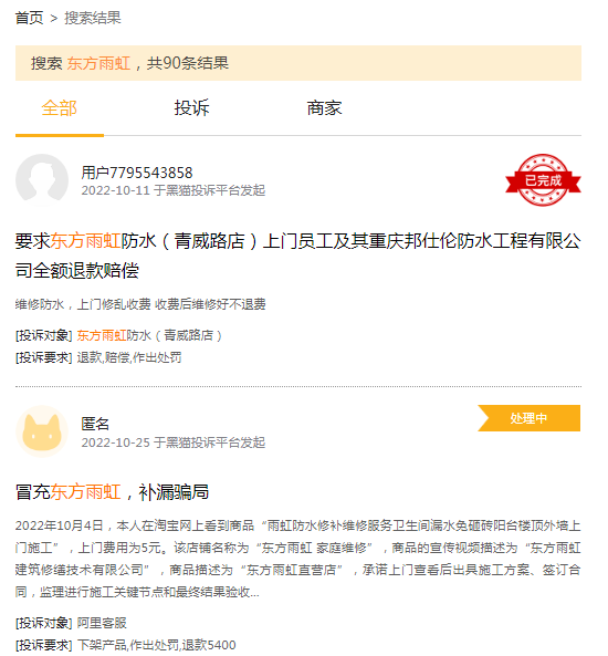 浏览黑猫投诉,截至2022年11月25日18时,“东方雨虹”相关投诉90条,涉及退费纠纷、冒牌商家、维修无效果、虚假宣传,“三无”产品等质疑。