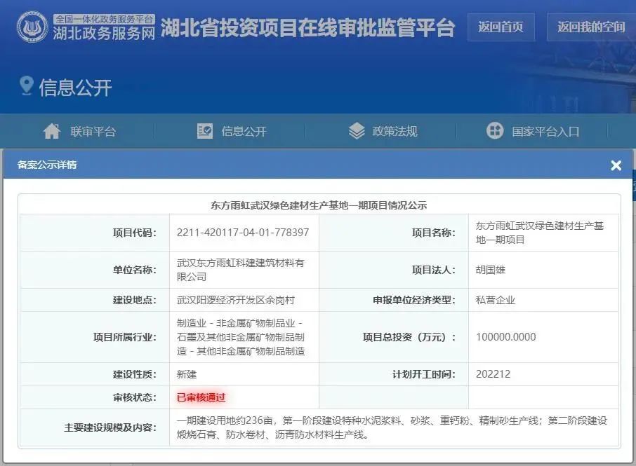 近日,东方雨虹武汉绿色建材生产基地一期项目情况公示,据公示内容,项目总投资10亿元,计划于12月开工。