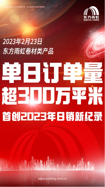 2023年,东方雨虹市场占有率节节攀升,各类产品表现亮眼,不仅获得市场、客户的广泛关注,销售业绩更是水涨船高,实现快速增长。2023年2月23日,东方雨虹卷材类产品单日订单量超300万平米,首创2023年日销新纪录;截至目前,东方雨虹卷材类产品已累计销售超千万平米。