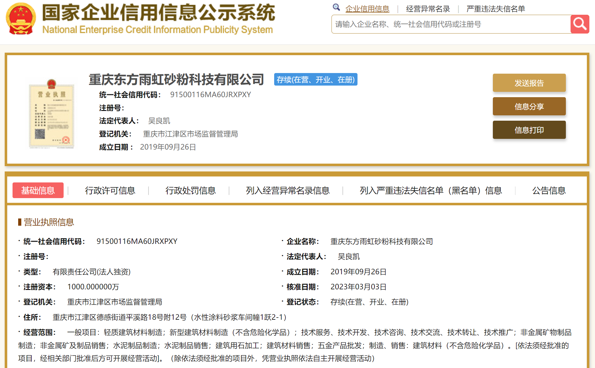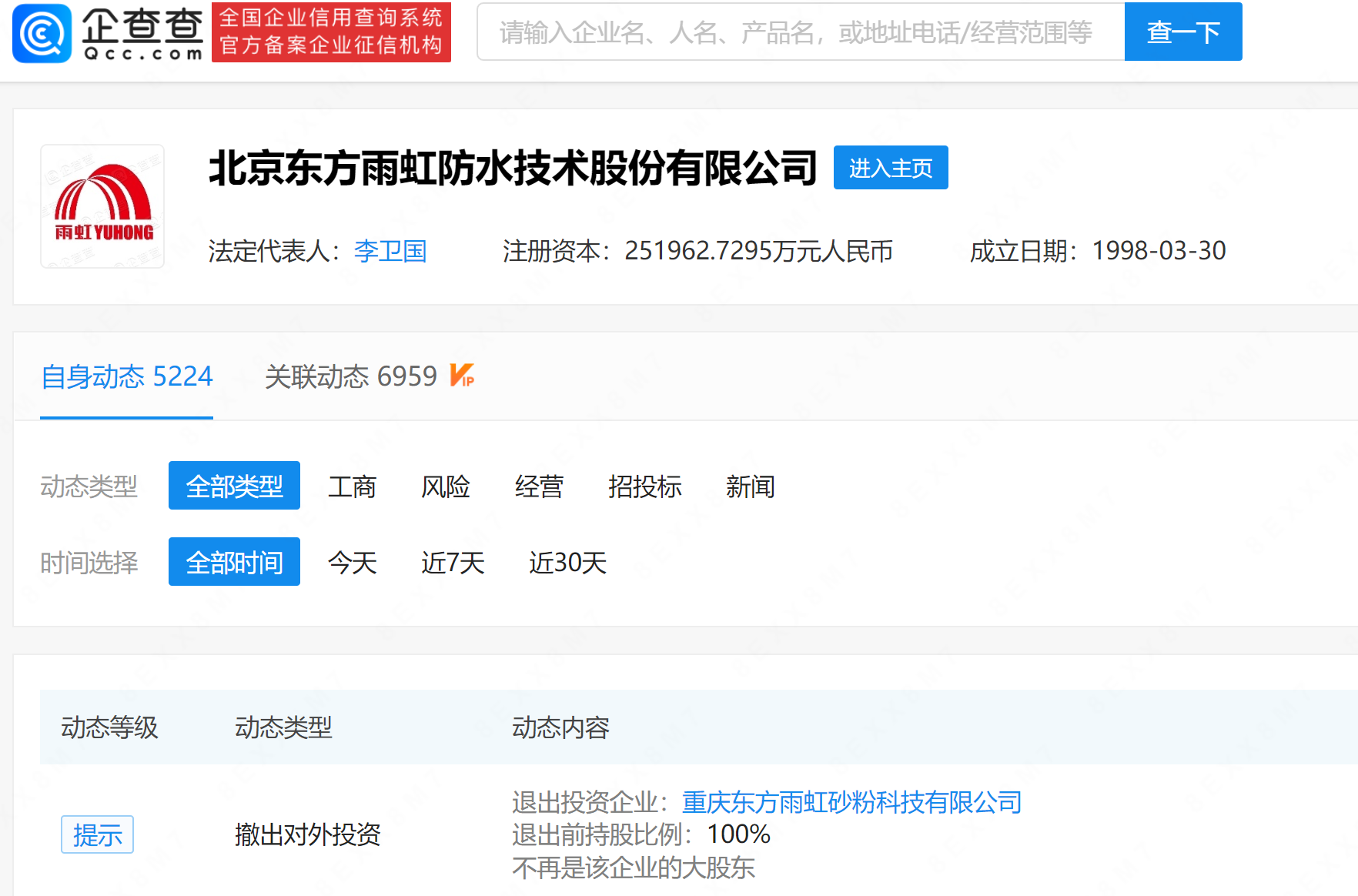 3月6日消息,查询显示北京东方雨虹防水技术股份有限公司(以下简称“东方雨虹”)退出重庆东方雨虹砂粉科技有限公司100%。
