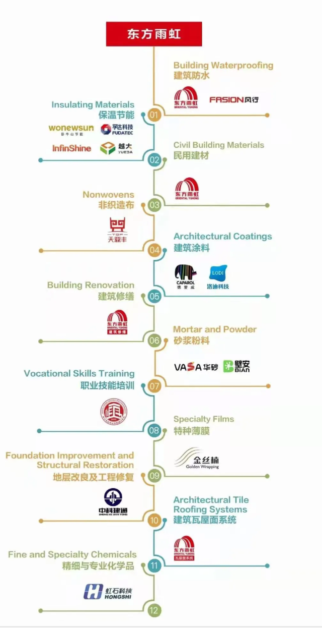 东方雨虹成立于1995年,二十余年来,为数以万计的重大基础设施建设、工业建筑和民用、商用建筑提供高品质的系统解决方案,已成为优质的建筑建材系统服务商。执行多元化的发展策略,作为建筑建材系统服务商,多年来东方雨虹依托防水作为主营业务,凭借防水客户的协同性积极进行多品类扩张。目前已涉及家装辅材、建筑涂料、保温材料、建筑修缮、职业技能培训、特种薄膜、底层改良及修复、建筑屋瓦面系统和精细与专业化学品等多个品类。不断拓宽业务渠道,着眼未来,布局既有存量建筑市场,大力发展建筑修缮领域,实现多板块业务的协同发展。二十余年来在建材行业的深刻沉淀,完成了企业从材料制造商到系统服务商的转型升级,在研发实力、工艺装备、应用技术、销售模式、专业的系统服务能力、品牌影响力等方面均居建材行业前列。