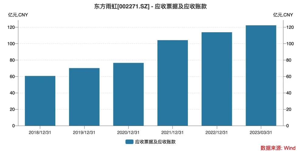 另一方面,应收账款一直是东方雨虹的一颗隐形的“雷”。截至2022年末,公司应收账款及应收票据余额为113.87亿元,截至今年一季度末,这个数字已达到122.28亿元,占总资产的23.68%。