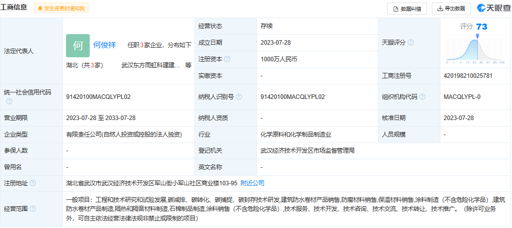 8月8日东方雨虹发布公告,武汉市东方雨虹经虹科技工程有限公司成立,注册资本1000万元人民币,经营范围包含:工程和技术研究和试验发展;碳减排、碳转化、碳捕捉、碳封存技术研发等。资料显示,该公司由东方雨虹(002271)100%控股。