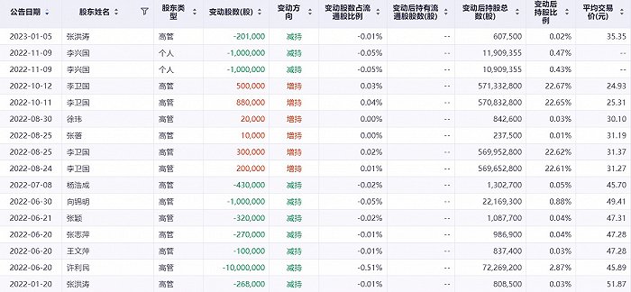 重要股东交易记录显示,2022年东方雨虹7位高管共计减持1238.8万股,减持价格均在每股45元以上,实控人之一致行动人李兴国2022年11月在大宗交易平台共计减持了200万股,未显示价格。与此同时,实控人李卫国及高管徐玮、张蓓在2022年8月至10月间合计竞价交易增持了191万股,价格在24.93至31.37元之间。