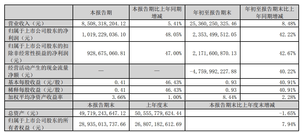 据公告,2023年第三季度,东方雨虹营业收入85.08亿元,同比增5.41%;归属于上市公司股东的净利润10.19亿元,同比增48.05%。