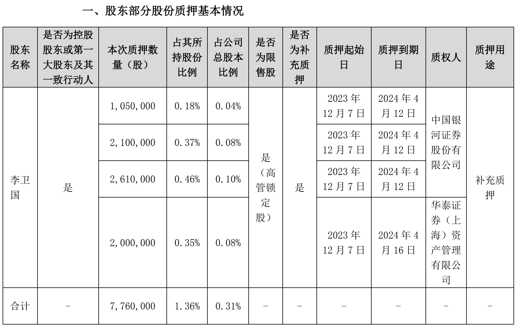 公告显示,东方雨虹近日接到公司控股股东、实际控制人李卫国函告,获悉李卫国所持有东方雨虹的776万股股份被质押,占东方雨虹总股本比例为0.31%。