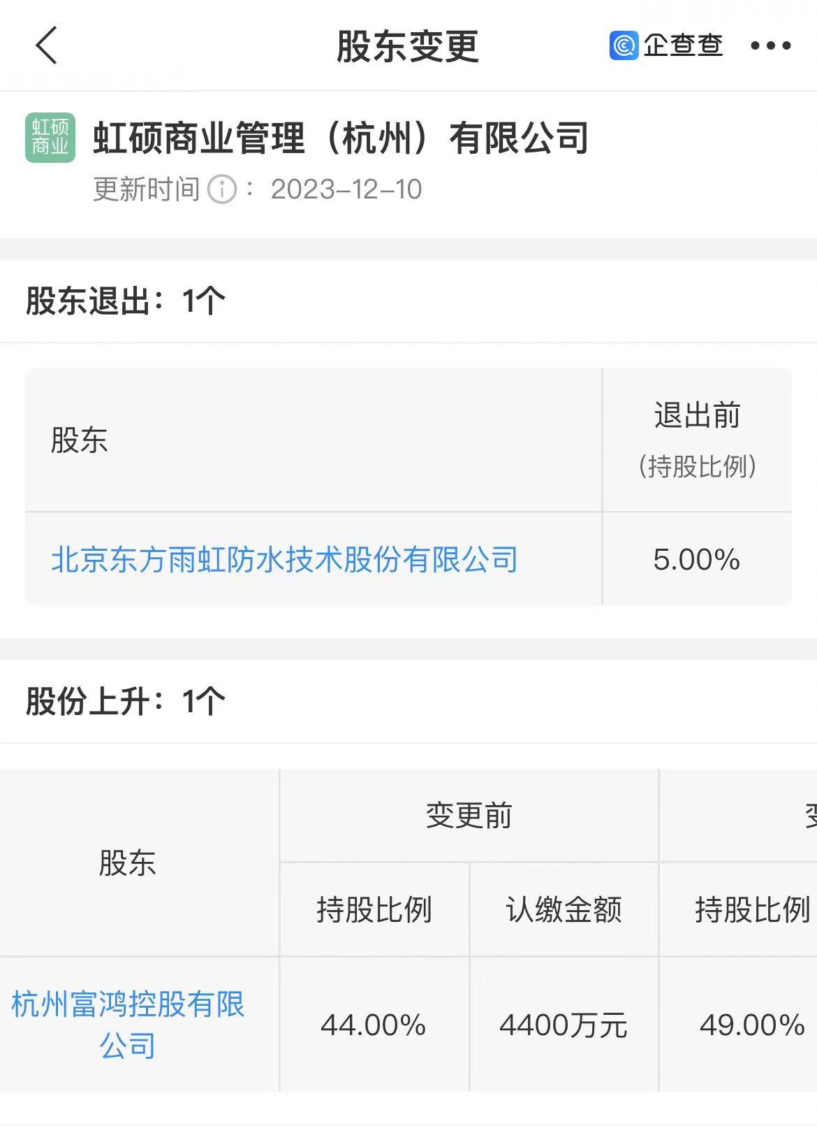 12月11日,北京东方雨虹防水技术股份有限公司(以下简称“东方雨虹”)转让虹硕商业管理(杭州)有限公司(以下简称“虹硕商业”)5%股权,杭州富鸿控股有限公司(以下简称“杭州富鸿控股”)接盘。