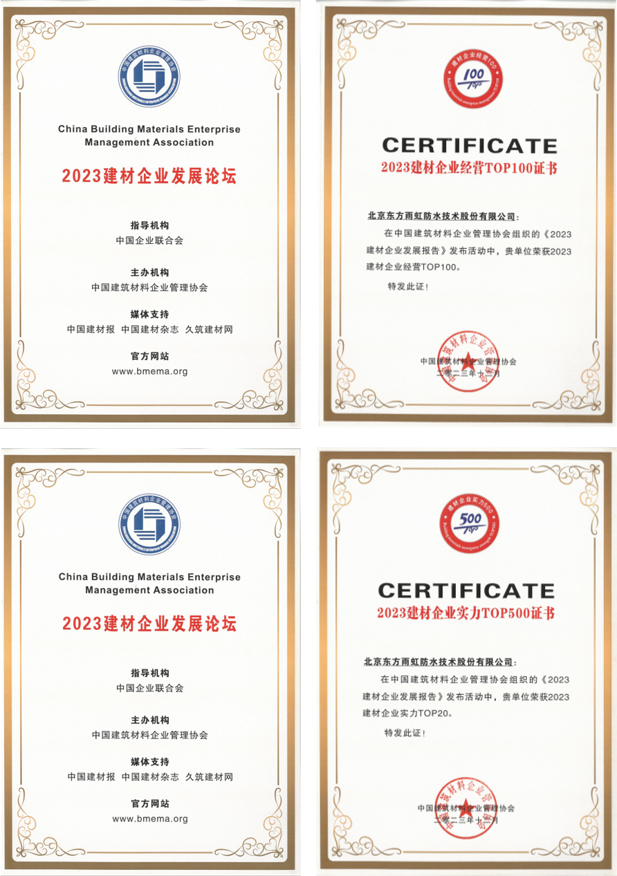 2023年以来,企业先后上榜2023中国民营企业500强、2023中国制造业民营企业500强、2023年《财富》中国500强、2023年《财富》中国上市公司500强、2023年度典范家居品牌、“联合国工发组织中国建筑业企业社会责任优秀案例”“2023 IDC中国未来数字工业领航者”等荣誉榜单,充分体现出社会各界对东方雨虹发展实践成效的认可与肯定。