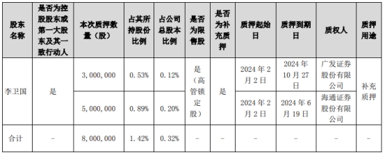 东方雨虹昨晚披露的关于公司控股股东进行股票质押式回购交易的公告显示,李卫国持有公司股份564,432,887股,占公司总股本的22.41%,其累计质押所持公司股份为322,963,639股,占公司总股本的12.82%,占其所持公司股份的57.22%。李卫国及其一致行动人李兴国合计持有公司股份575,342,242股,占公司总股本的22.84%,完成本次部分股份质押后,累计质押所持公司股份为322,963,639股,占公司总股本的12.82%,占其所持公司股份的56.13%。