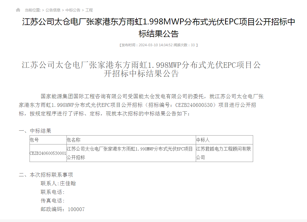 国际能源网获悉,3月10日,国家能源集团江苏公司太仓电厂张家港东方雨虹1.998MWP分布式光伏EPC项目公开招标中标结果公告发布。