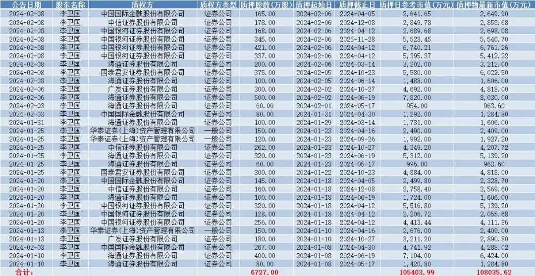 根据中登数据统计2024年以来,李卫国的股权质押高达31次,累计质押6727万股,用途主要是帮助公司解决营运现金。