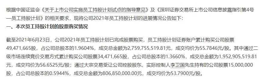 2021年3月27日,东方雨虹首次披露《2021年员工持股计划(草案)》,员工持股计划的总份数为不超过17亿份,计划参与对象共计1611人。截至同年6月23日,员工持股计划的股票购买累计近5000万股,最终参与对象为1411人,占总股本1.9604%,总投入约27.6亿元,平均成交价55.78元/股,自筹基金与融资基金比例1:1,股票锁定期12个月。