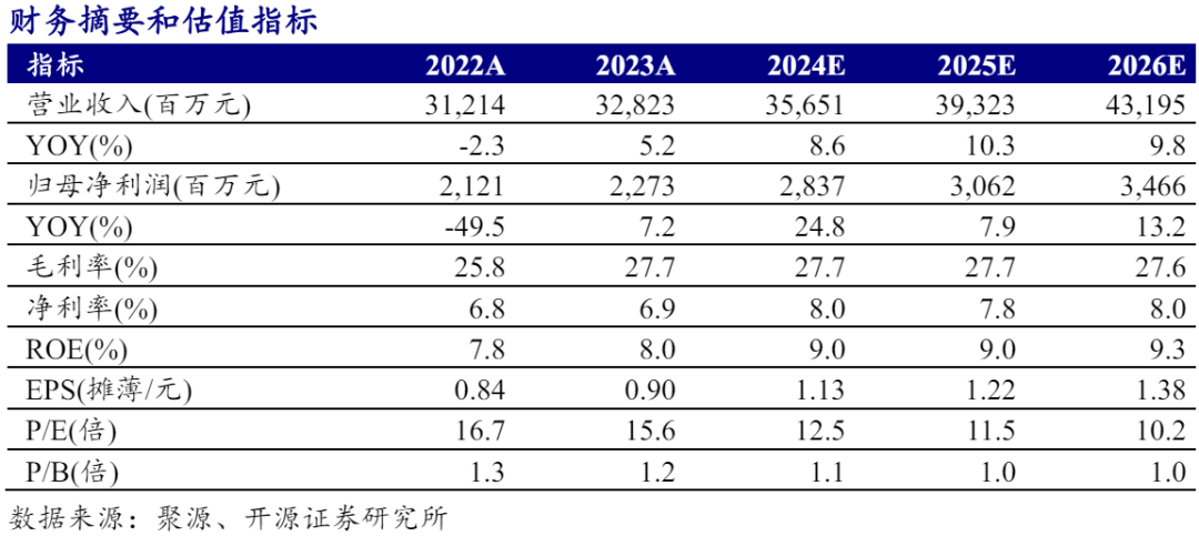公司发布年报:2023年公司实现营业收入328.23亿元,同比+5.15%;实现归母净利润22.73亿元,同比+7.16%;实现扣非后归母净利润18.41亿元,同比+2.05%。综合毛利率27.69%,同比+1.92pct;净利率6.97%,同比+0.18pct。其中Q4实现营业收入74.62亿元,环比-12.29%;实现归母净利润-0.80亿元,环比-107.87%;实现扣非后归母净利润-3.31亿元,环比-135.63%。考虑到房地产行业下行,公司业绩承压以及坏账压力,我们适当下调2024-2025年盈利预测,并新增2026年盈利预测,我们预计2024-2026年公司实现归母净利润28.4/30.6/34.7亿元(2024-2025前值为52.2/70.0亿元),同比+24.8%/+7.9%/+13.2%;EPS分别为1.13/1.22/1.38元;对应当前股价PE为12.5/11.5/10.2倍。考虑公司为行业龙头,多品类扩张驱动长期成长,维持“买入”评级。维持“买入”评级。