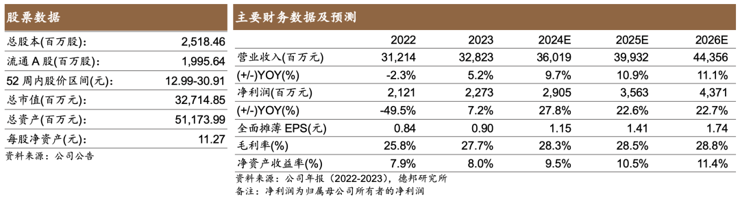 在行业下行周期,公司作为防水行业龙头,加速渠道变革,业务多元化发展抵御单一品类的失速风险,从经营情况来看,公司战略调整初见成效,经营质量稳步提升,静待地产触底企稳后公司业绩更进一步;考虑到短期地产磨底带来的需求承压,我们维持24-26年公司归母净利润分别为29.05、35.63和43.71亿元,对应EPS分别为1.15、1.41、1.74元,对应PE估值分别为11.3、9.2、7.5倍。